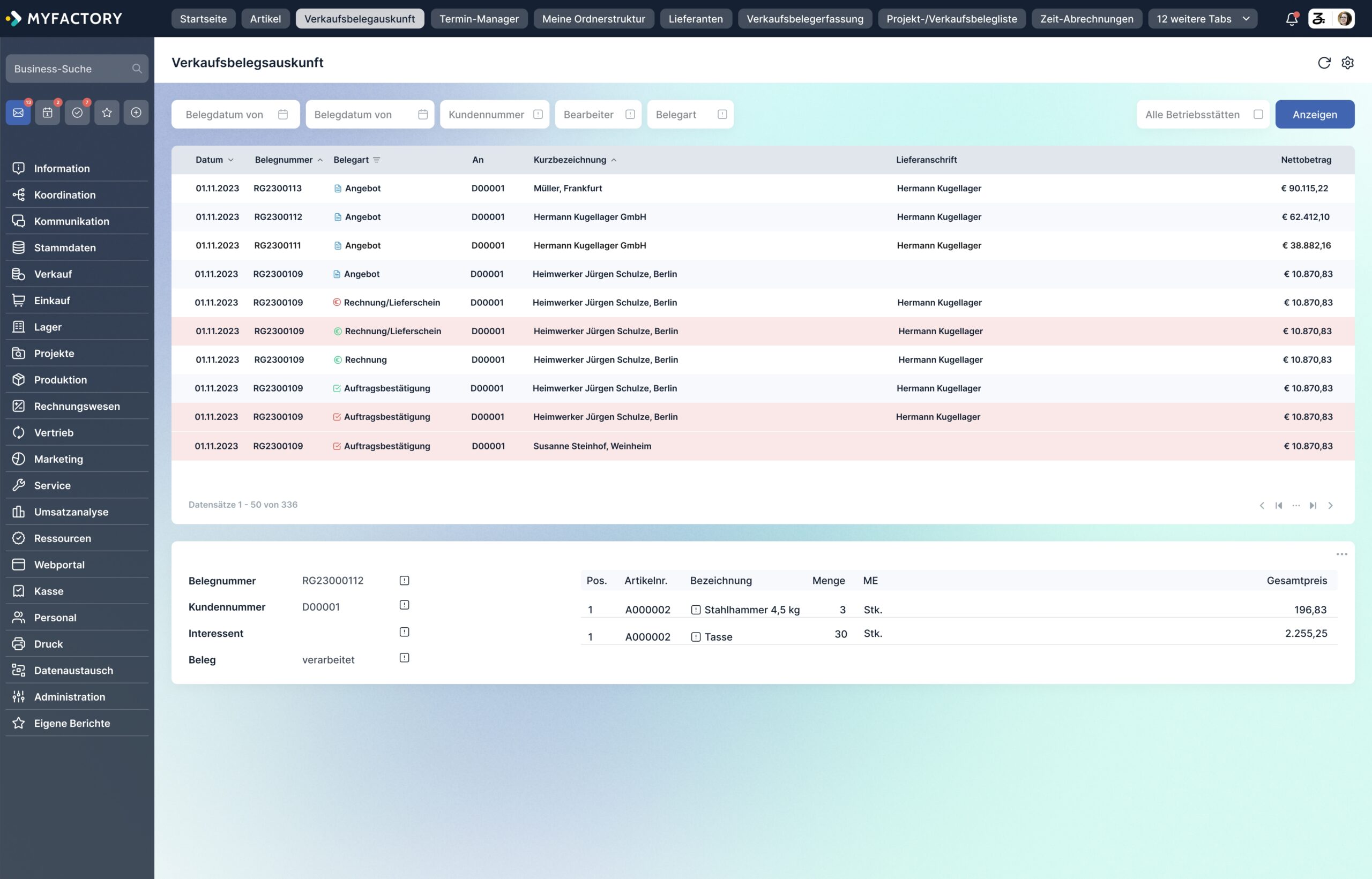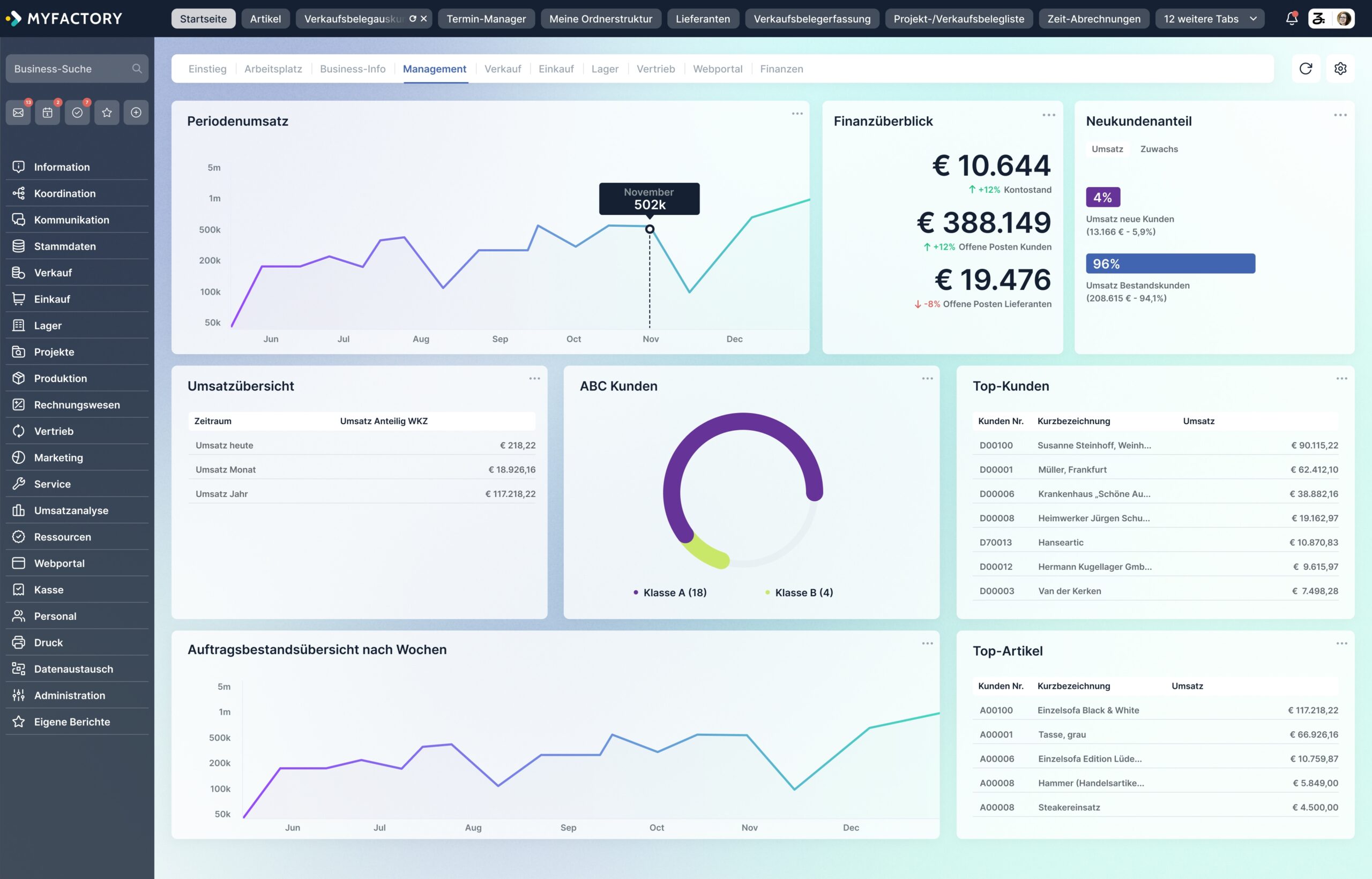MYFACTORY.ERP umfasst grundlegenden Funktionen wie Einkauf, Verkauf, Lagerhaltung, Disposition sowie alle Informationen zu Kunden, Lieferanten, Mitarbeitern, Vertretern und Artikeln.